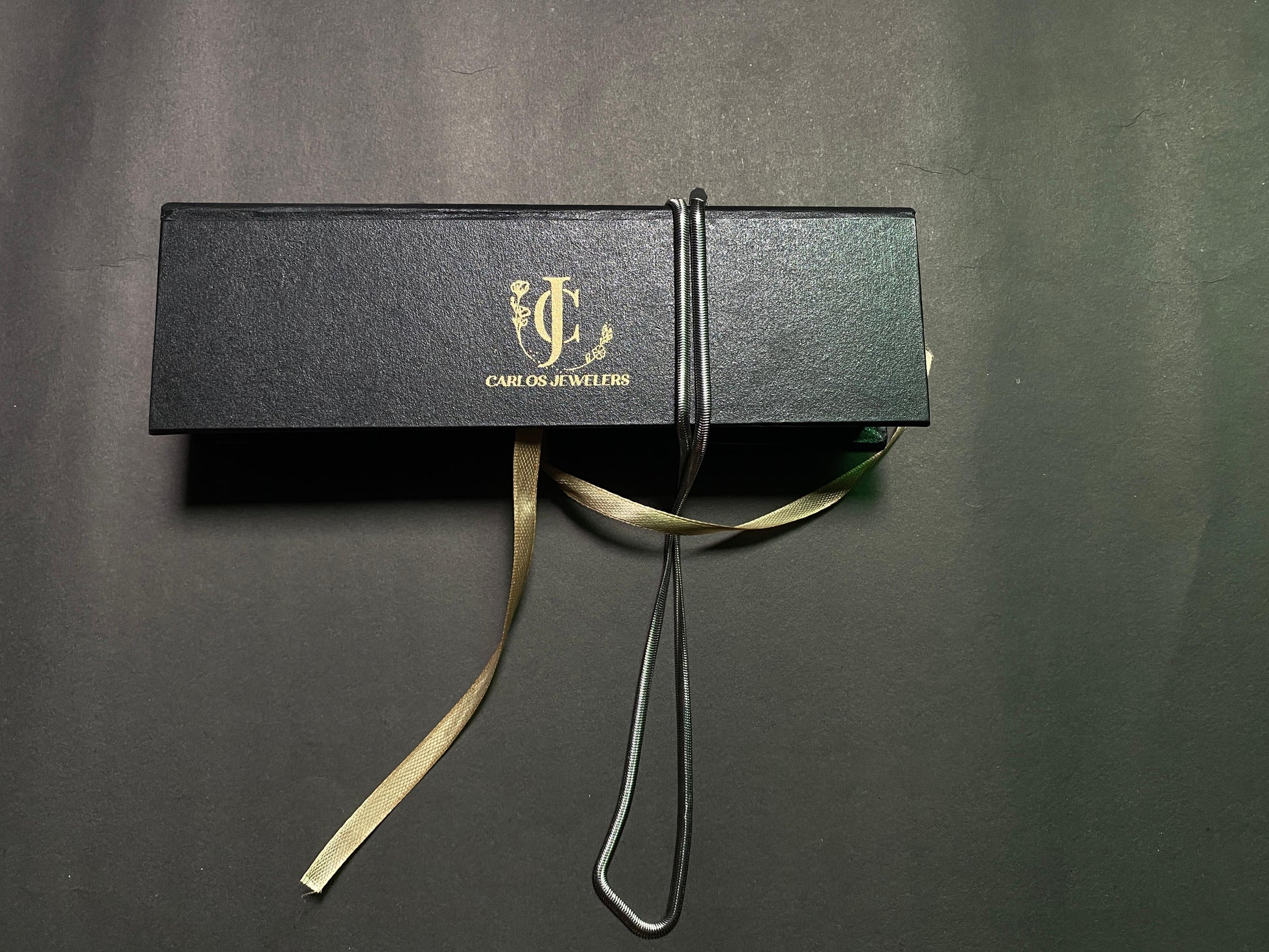 - Indulge in luxury with our Carlos Jewelers snake chain necklace. The premium black gift box, complete with a golden ribbon accent, adds to the sophisticated look. Made with a smooth, flexible design, this necklace reflects light beautifully, making it a timeless and modern accessory. Perfect for special occasions, this necklace is sure to impress.